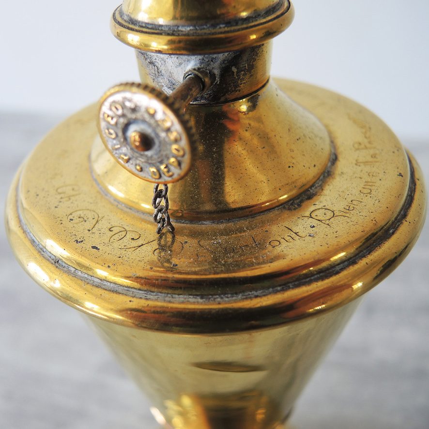 Superbe lampe à pétrole / essence minérale « Pigeon » vintage en laiton.