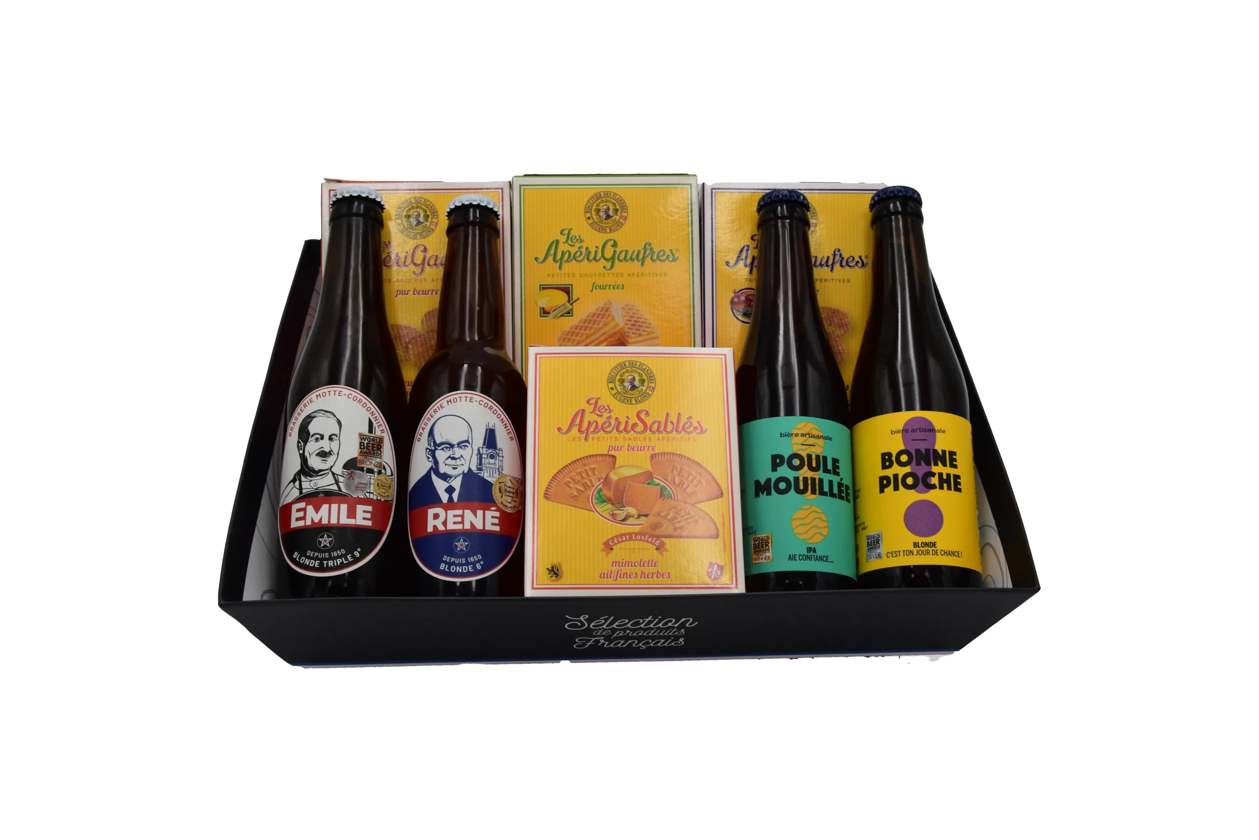 Offrez-vous un apéritif authentique avec ce panier gourmand composé de 4 bières artisanales (Émile, René, Bonne Pioche et Poule Mouillée) aux saveurs uniques. Il est accompagné de délicieux biscuits salés : Apérisablés à la mimolette et ails et fines herbes (85g) et Apérigaufres aux saveurs Welsh, oignon 5 baies et gouda. Un assortiment idéal pour un moment convivial et savoureux !