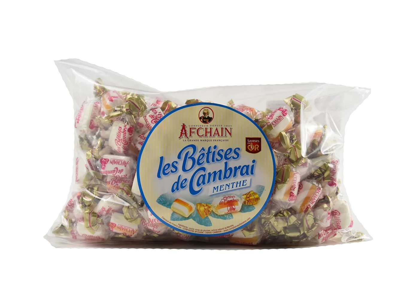 Les Bêtises de Cambrai sous format 1KG  à la menthe, fabriquées artisanalement dans les ateliers de la confiserie Afchain à Cambrai. Elle fait partie des grandes spécialités du Nord et est une confiserie connue à travers toute la France et même le monde !