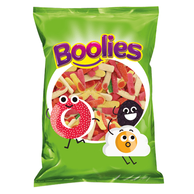 Sachet de 1kg de bonbon Boolies acidulé en forme de doigts.