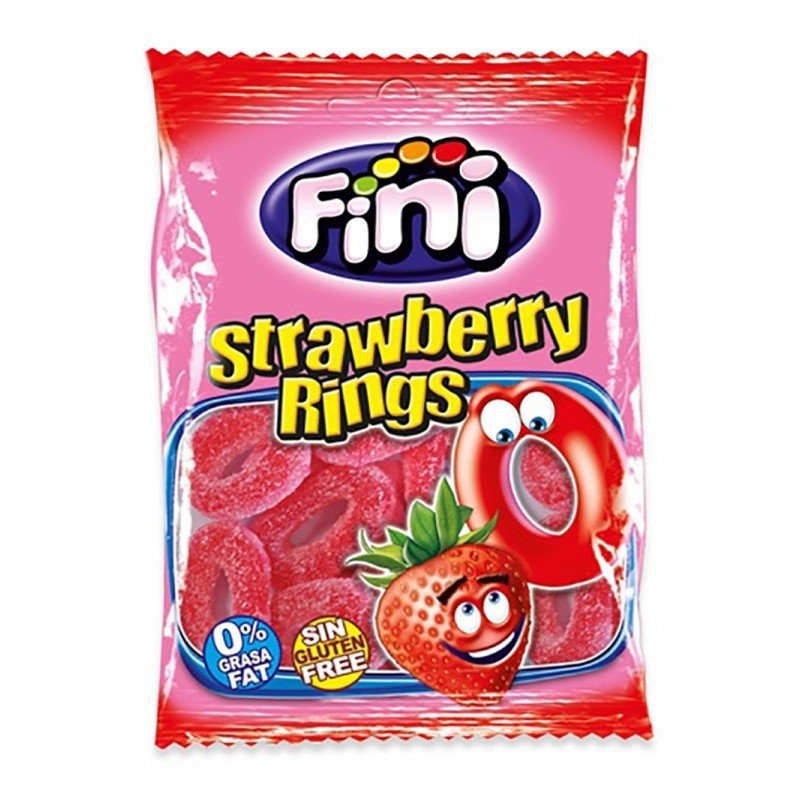 Boite de 12 sachets de bonbon Fini anneaux fraise 90g.