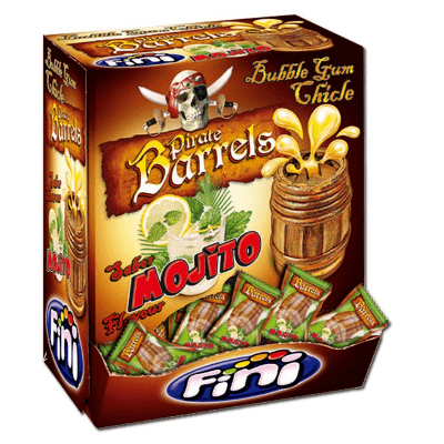 Achetez au meilleur prix les boules de chewing gum en forme de baril de pirate de la marque Fini.
