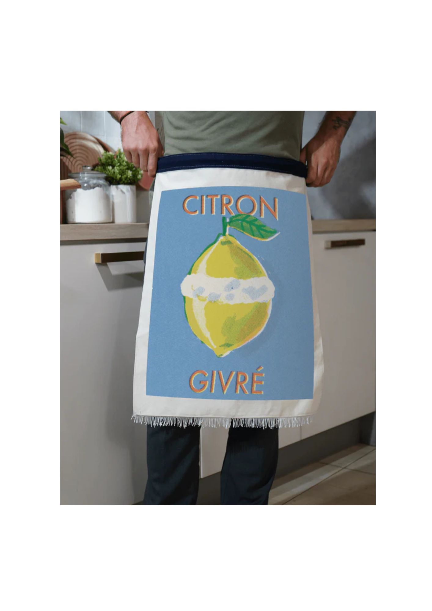 Grâce à son système innovant, ce tablier se suspend facilement au mur ou à une porte, transformant votre cuisine en véritable galerie d’art. L’illustration « Citron Givré », signée par Lucia Calfapietra, artiste marseillaise, apporte une touche fraîche et contemporaine à votre décor.