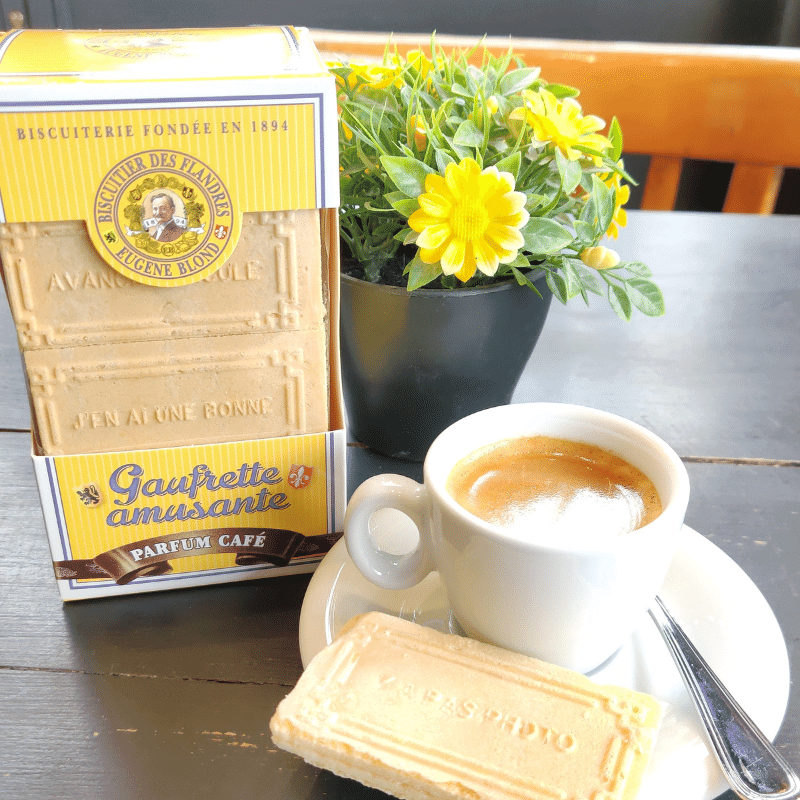 Spécialité bien connue dans le Nord de la France, la recette est aujourd’hui authentique et la cuisson se fait dans des fours traditionnels à la Biscuiterie Eugène Blond à Lambersart. Les arômes se multiplient pour le plus grand bonheur de tous, et les phrases humoristiques continuent d’amuser en ajoutant une touche de fantaisie aux gaufrettes.