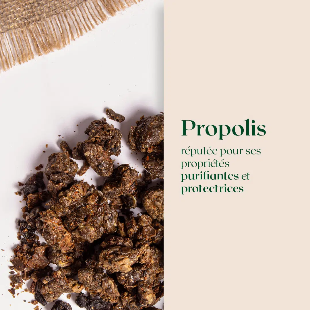 • Propolis : Un trésor de la ruche aux vertus purifiantes et protectrices, contribuant à accélérer la régénération de la peau.