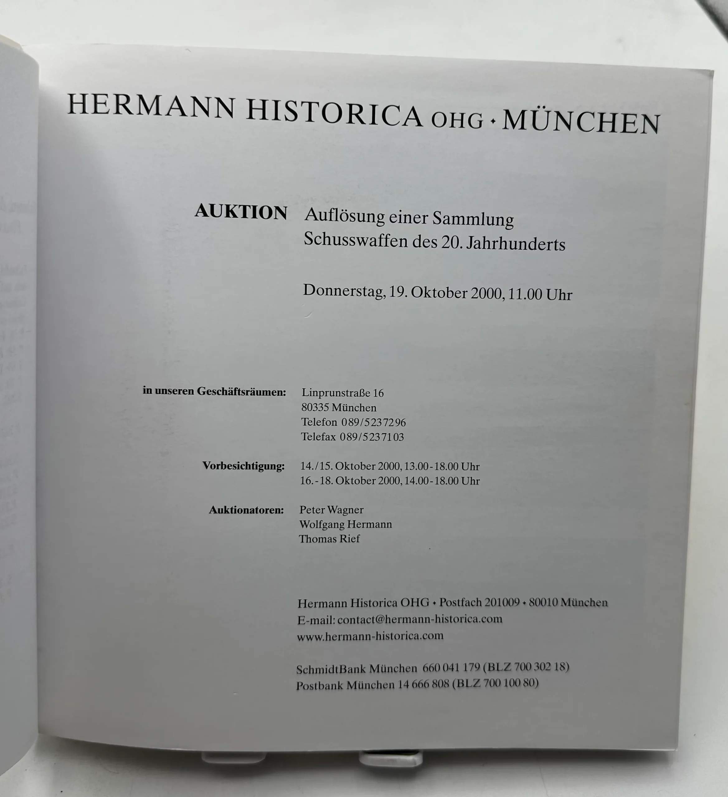 Ce catalogue de vente est publié par la maison de vente aux enchères Hermann Historica basée à Munich, en Allemagne. Il s’agit d’un catalogue de vente pour une vente aux enchères qui a eu lieu le 10 octobre 2000 et qui était consacrée à la dissolution d’une collection d’armes à feu du 20ème siècle.
