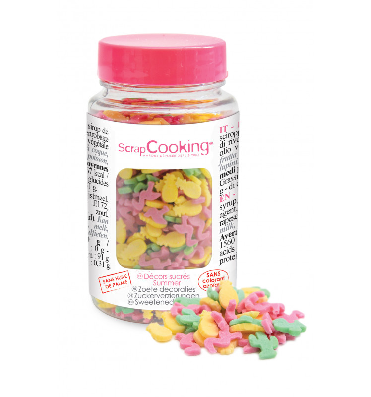 Scrapcooking® Propose Des Décors Sucrés Thème Summer Dans Un Pot Refermable Pour Embellir Vos Gâteaux, Biscuits, Cupcakes…Ces Décors Sont Sans Huile De Palme, Et Sans Colorant Azoïque. Trio De Décors Sucrés Ananas Jaunes, Flamants Roses Et Cactus Verts !