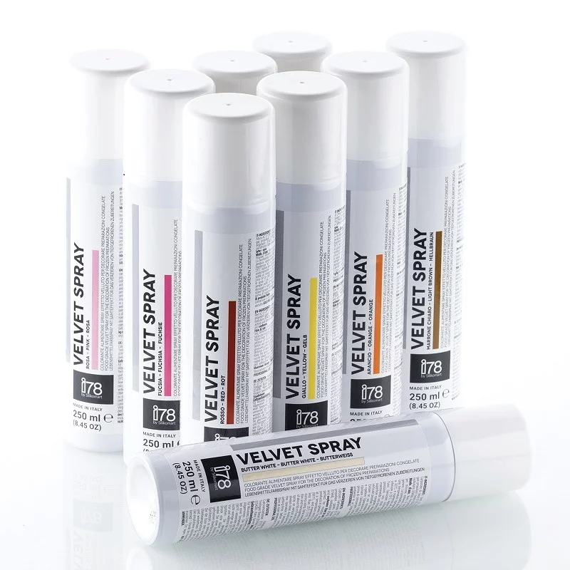 Vous souhaitez donner une décoration simple et élégante à la fois à votre dessert ? Optez pour ce spray velours qui donnera une couleur sublime à vos entremets.