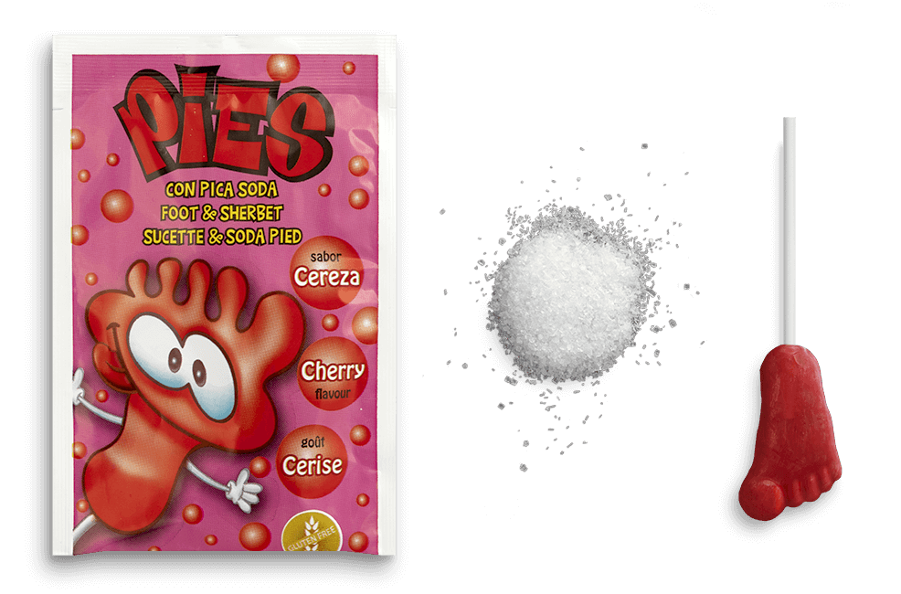Boite de 40 sachets de sucettes en forme de pied avec poudre pétillante.