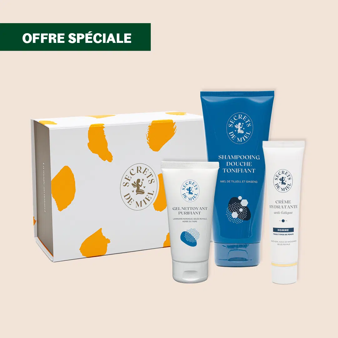 Notre sublime Coffret La vie est Miel composé de 3 soins pensés pour la peau des hommes :